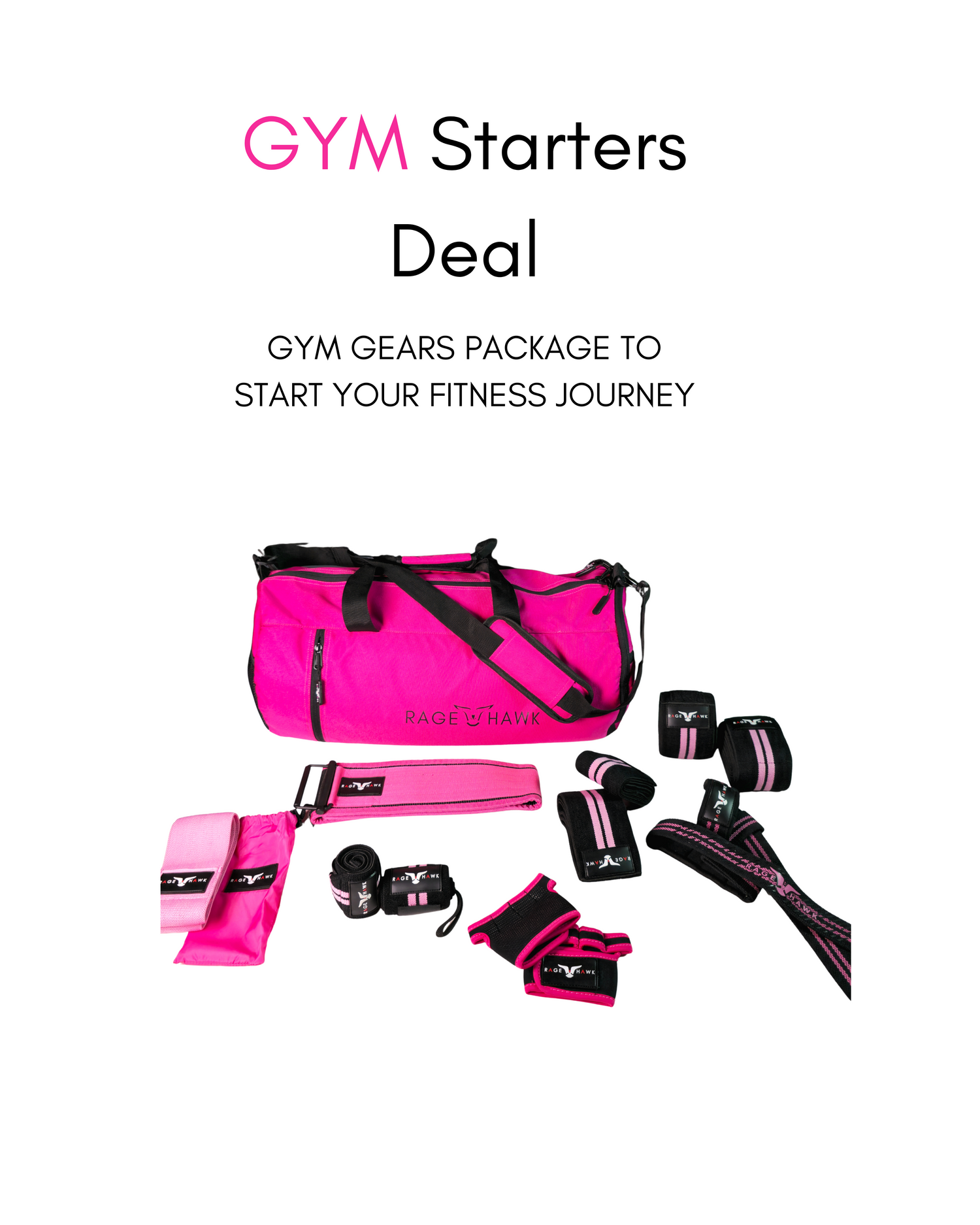 A comprehensive package designed for beginners and enthusiasts alike. This all-in-one bundle includes a durable duffel bag, a supportive weightlifting belt, adjustable palm grips, knee wraps, wrist wraps, elbow wraps, weightlifting straps and resistance bands—everything you need to train safely and effectively. This premium gear set features the iconic RageHawk design in bold pink and black, blending style with performance. Perfect for squats, deadlifts, and more, this deal is your gateway to strength and success.