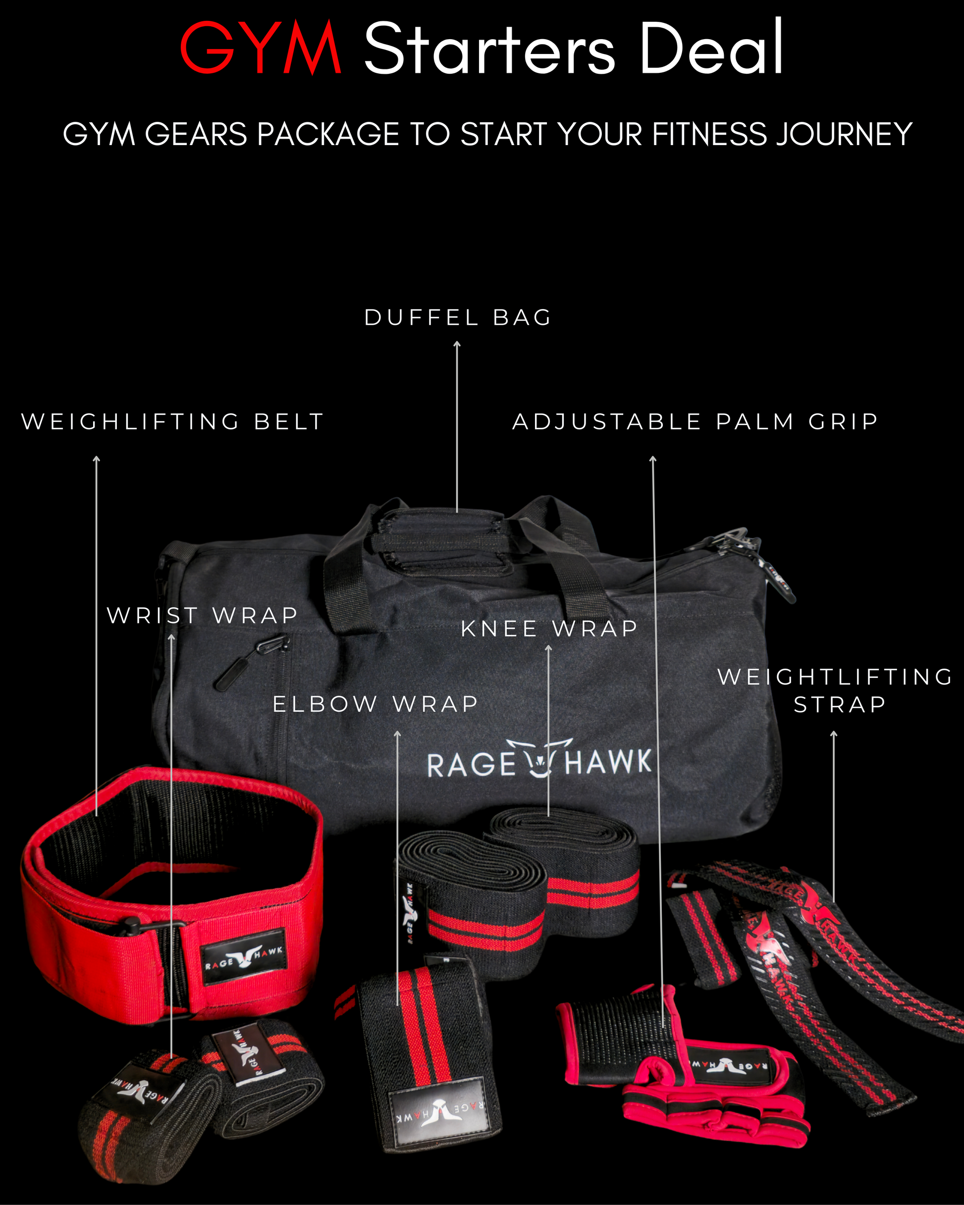 Kickstart your fitness journey with the RageHawk Gym Starters Deal, a comprehensive package designed for beginners and enthusiasts alike. This all-in-one bundle includes a durable duffel bag, a supportive weightlifting belt, adjustable palm grips, knee wraps, wrist wraps, elbow wraps, and weightlifting straps—everything you need to train safely and effectively. This premium gear set features the iconic RageHawk design in bold red and black, blending style with performance. Perfect for squats, deadlifts, and more, this deal is your gateway to strength and success.